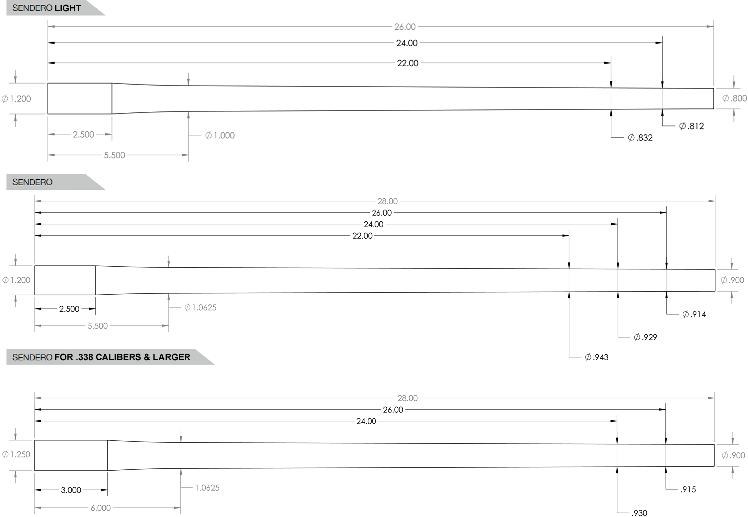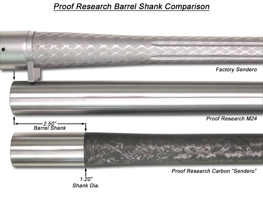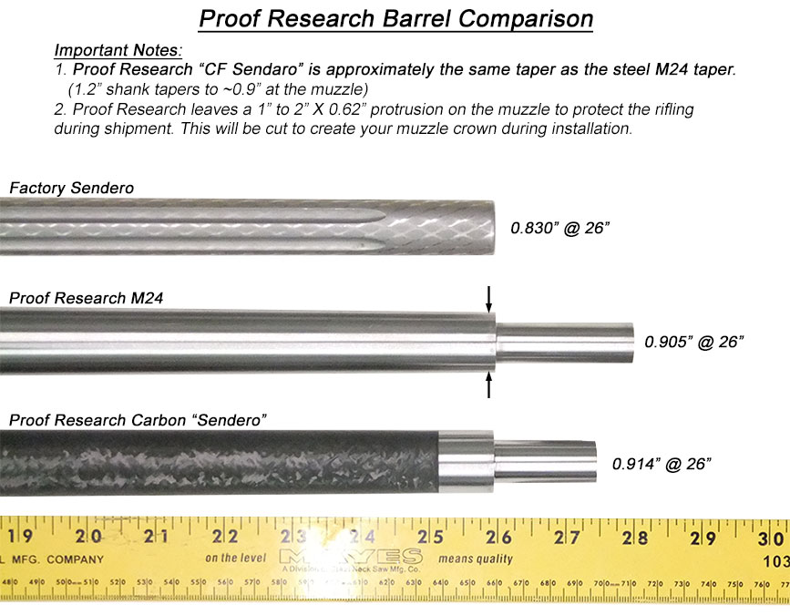 NOTE: The Proof Research Carbon Fiber "Sendero" actually measures very close to the standard M24 taper. (see product photos) This means you'll want to choose a stock that has enough meat in the forend to take it! This will include most varmint and tactical stocks we offer, although some fitting may be required if it is not specifically cut with an "M24" channel out of the box. Fitting the new stock to your new barrel is commonly included in the installation pricing quoted by most gunsmiths as the vast majority of new barrels are tapered differently than standard factory barrels and must be routinely fitted to the stock. If you have any questions regarding the suitability of a particular stock for these outstanding new barrels, please open a chat, send us a message or call our tech support and we'll be happy to compare the barrel to the stock in-house while you're online or before shipment to be certain.
